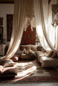 - Textiles: You will often see Moroccan Beni Ourain rugs, Turkish kilims, or Indian block-print fabrics.