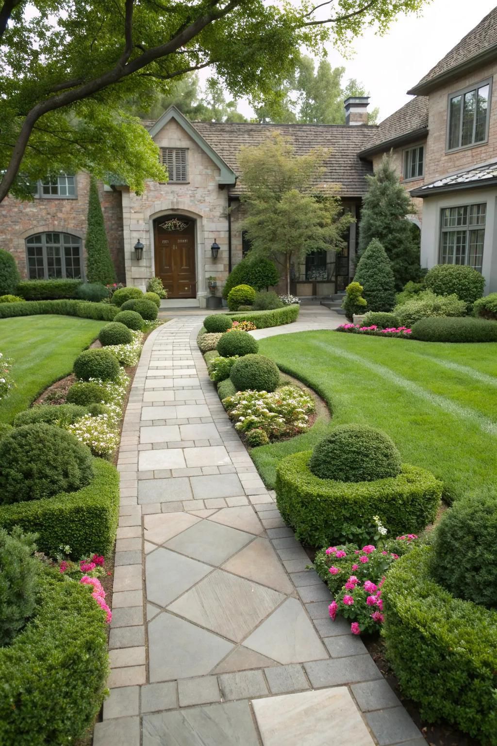 Frame your entrance with a symmetrical garden design featuring matching planters, topiaries, or flowering shrubs. This classic approach creates balance and draws attention to your entryway, making it one of the most effective front yard landscaping ideas for traditional homes.