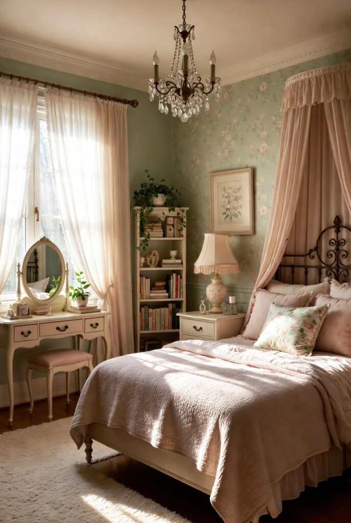 Look for wallpaper with large-scale floral prints rather than tiny, busy patterns. Pair this with painted wooden furniture—perhaps a distressed white dresser or a mint green bed frame. Soft, ruffled bedding and vintage-inspired lighting fixtures, like a small crystal chandelier or a brass bedside lamp, complete the look. This style feels sophisticated yet whimsical.