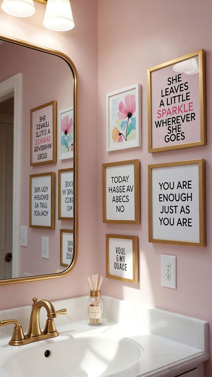 Personalize your girly bathroom with wall art featuring empowering quotes or whimsical illustrations. Frames in gold or rose gold hold prints like “Be Your Own Kind of Beautiful” or abstract florals.