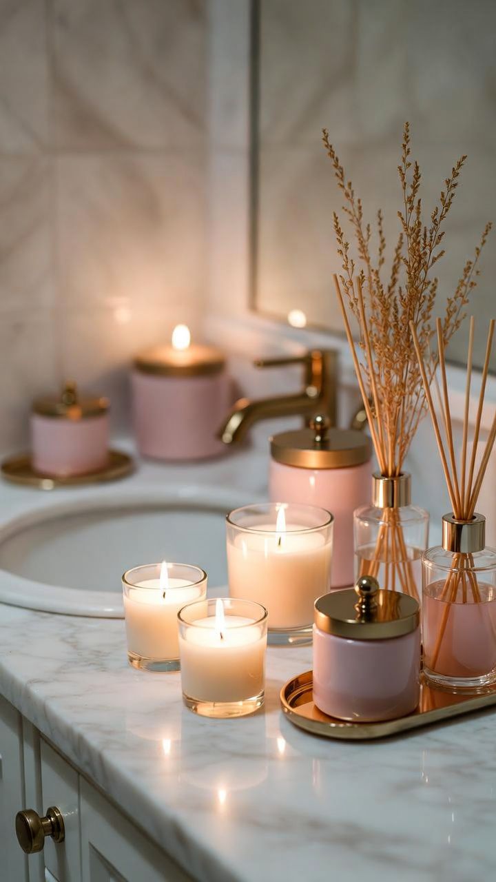 Scent plays a huge role in a girly bathroom’s atmosphere. Place scented candles in vanilla or jasmine on vanities, or use reed diffusers for constant fragrance.