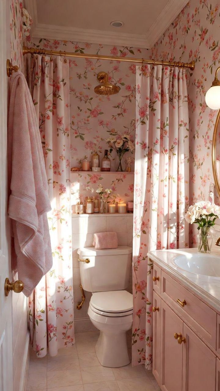 Florals are a staple in any girly bathroom, bringing in nature’s beauty with a romantic twist. Wallpaper with oversized peonies or dainty daisies can transform plain walls into a garden oasis. If wallpaper feels too permanent, opt for removable decals or shower curtains featuring blooming roses.