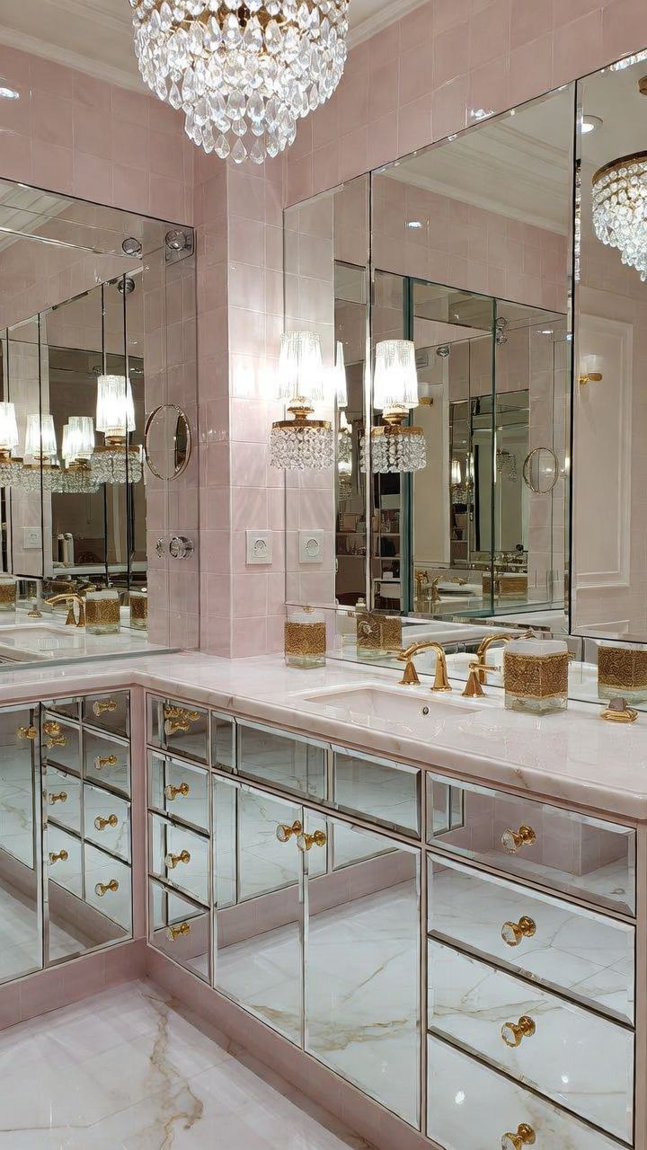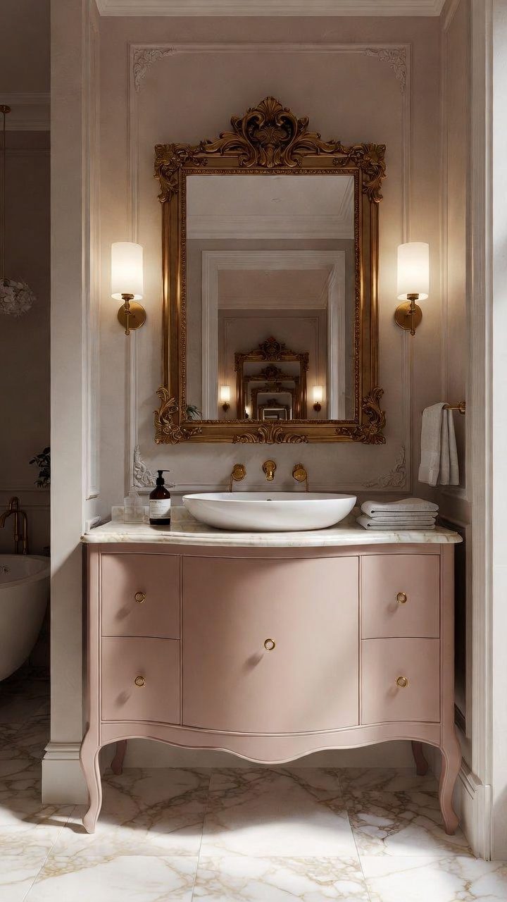 Mirrors amplify light and space, making them ideal for a girly bathroom. Invest in mirrored cabinets or side tables that reflect the room’s soft tones, creating an illusion of expansiveness.