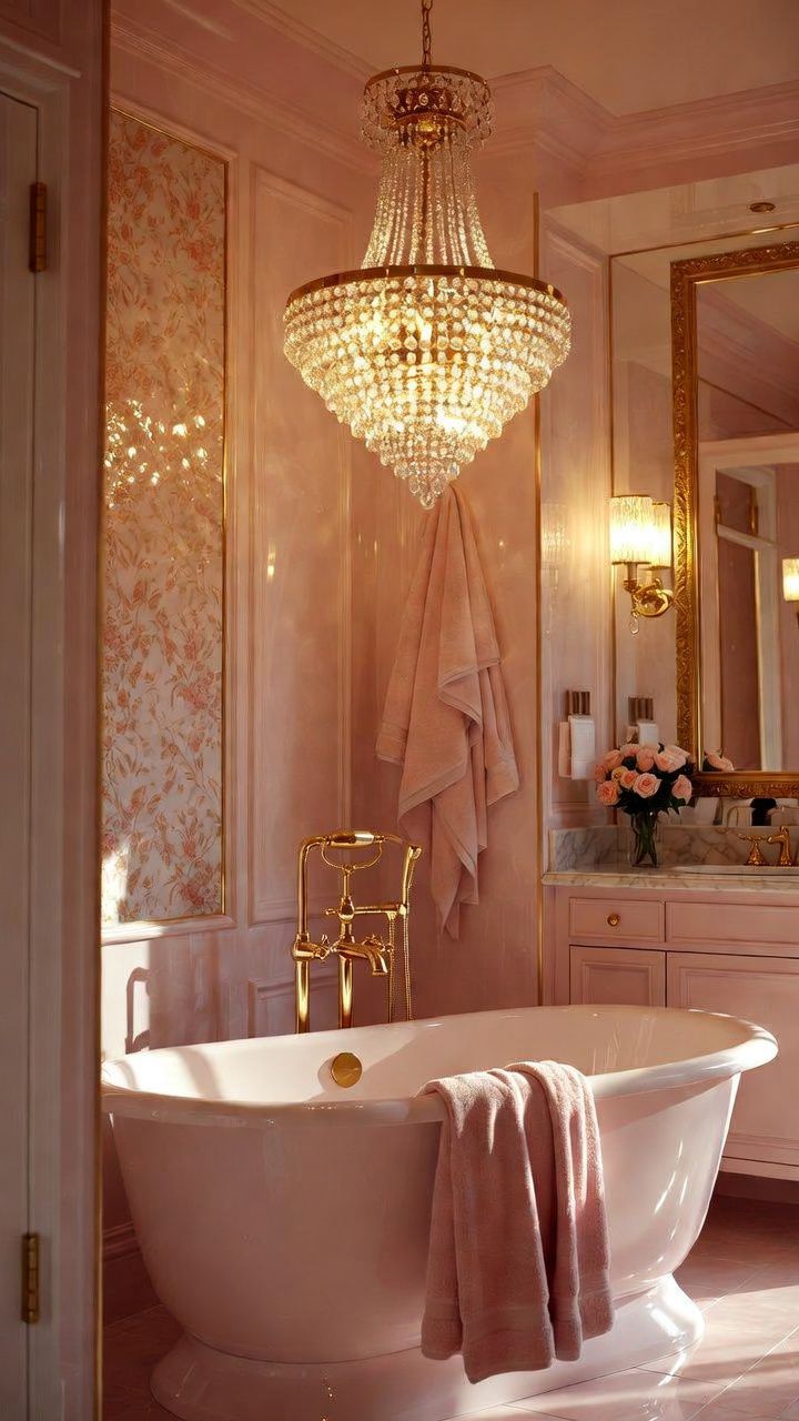 Choose a smaller fixture for compact spaces to avoid overpowering the area. Pair it with dimmable sconces for versatile lighting—soft glows for relaxing baths and brighter settings for morning routines. This idea incorporates semantic elements like “elegant bathroom lighting,” making your girly bathroom a standout in design searches.