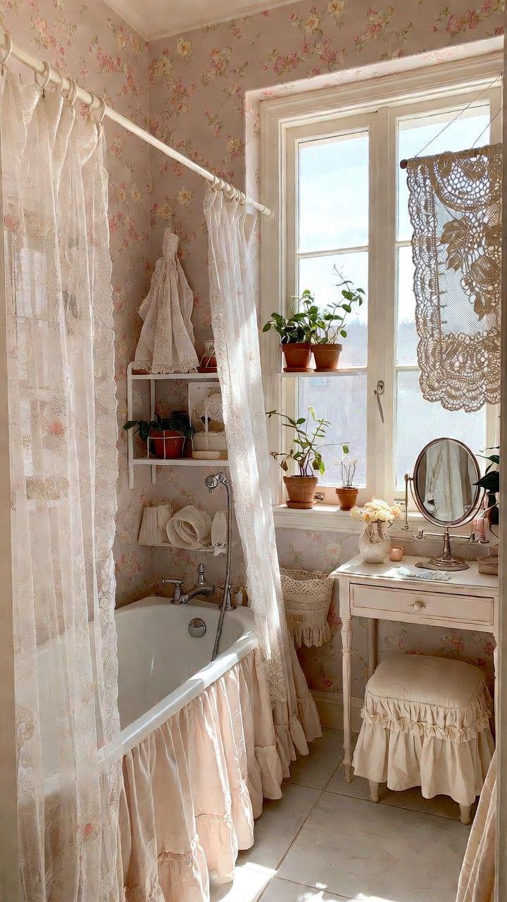 Curtains aren’t just for windows; in a girly bathroom, they add texture and softness. Opt for lace panels on shower rods or ruffled valances around mirrors to create a dreamy, ethereal feel.