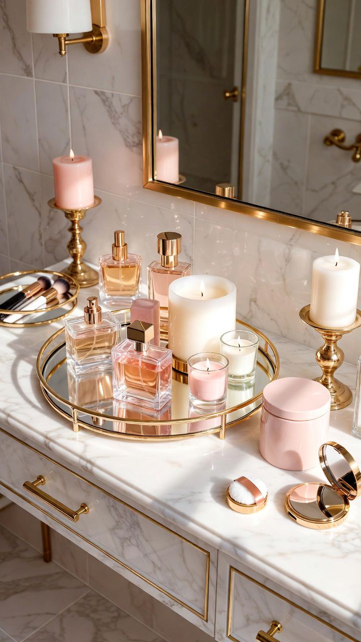 Turn your girly bathroom into a boutique with a dedicated display for perfumes and beauty essentials. Use floating shelves or a mirrored tray on the countertop to showcase bottles like art pieces.