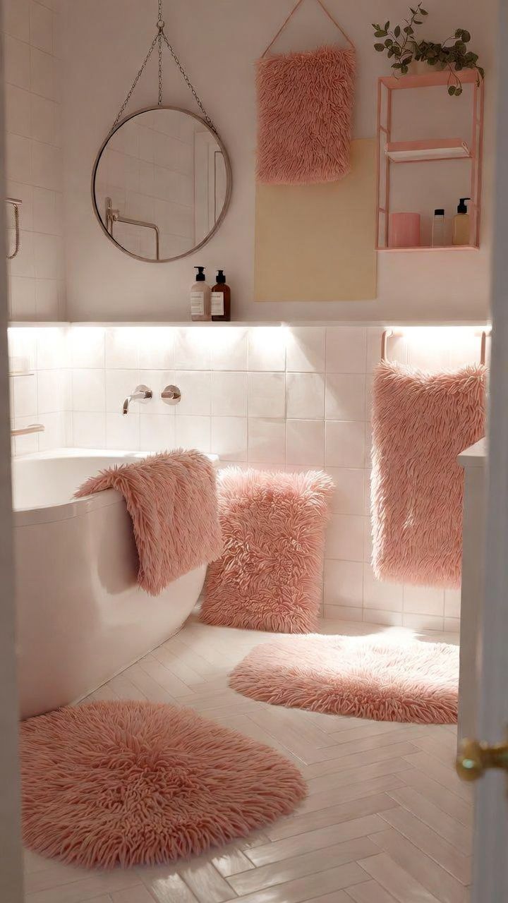 No girly bathroom is complete without plush underfoot comfort. Layer a shaggy rug in bubblegum pink over neutral tiles, or choose one with fringe details for added texture.